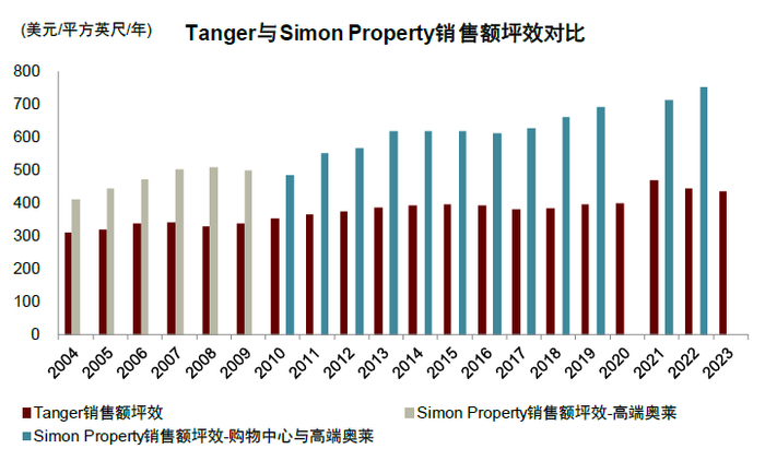 注:2010年前西蒙地产分别披露购物中心与高端奥莱坪效,2010年及以后则将两类物业数据合并披露。