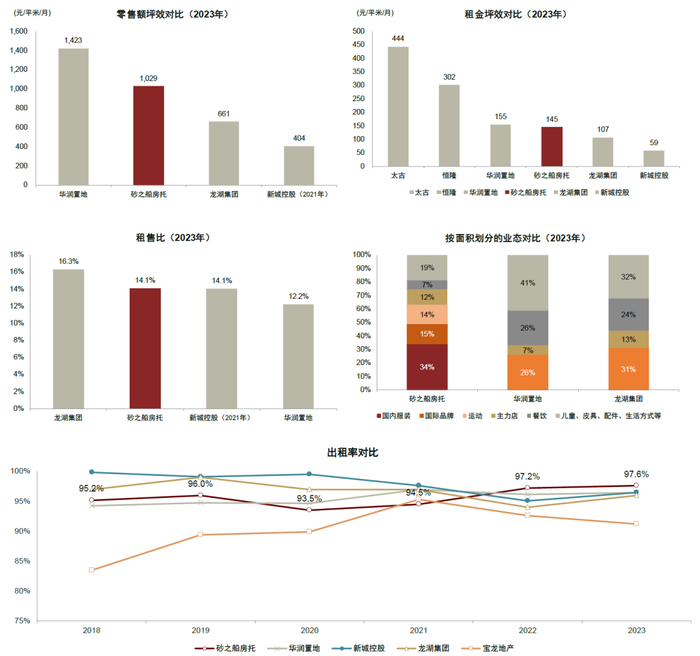 经营成果:头部奥莱运营商在经营效率方面或具备一定优势。我们对比了上市专业奥莱运营商砂之船房托(Sasseur REIT)[5]和重点购物中心运营商如华润、龙湖、新城等的经营数据,发现砂之船房托在零售额及租金坪效方面相较典型大众运营商而言具一定优势,我们认为这或得益于其品牌组合中零售浓度较高(2023年零售业态占已租面积63%,对比华润和龙湖分别为26%和31%),而零售品牌坪效及租售比均相对体验类业态更高。此外,2018-2023年砂之船房托平均出租率相对稳定,到2023年末出租率达到97.6%、高于其他可比购物中心运营商。