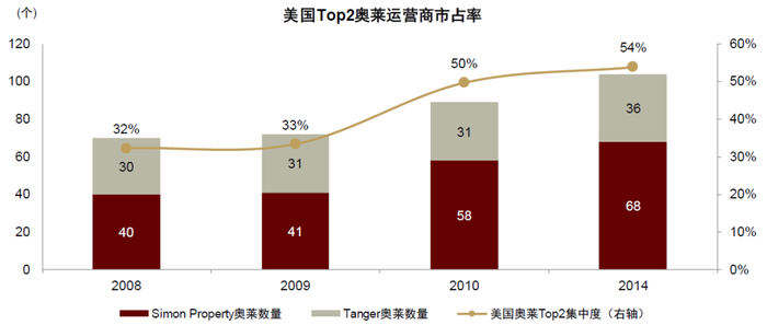 美国奥特莱斯市场格局高度集中,到2014年两大龙头西蒙地产(Simon Property)和Tanger旗下的奥特莱斯数量已经占到行业总量的50%以上。我们认为这背后的核心原因一为龙头的顺周期资本运作、收并购整合市场,二是奥莱市场本身未见扩容、甚至处于缩量通道,已经“跑出来”的优质项目便具备更强优势。本章中,我们以奥特莱斯专业运营商Tanger为例,分析其发展历程及长周期经营成果。