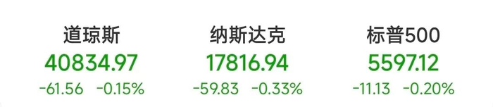 当地时间8月20日,美股三大指数小幅收跌。截至收盘,道指跌61.56点,跌幅为0.15%,报40834.97点;纳指跌59.83点,跌幅为0.33%,报17816.94点;标普500指数跌11.13点,跌幅为0.20%,报5597.12点。