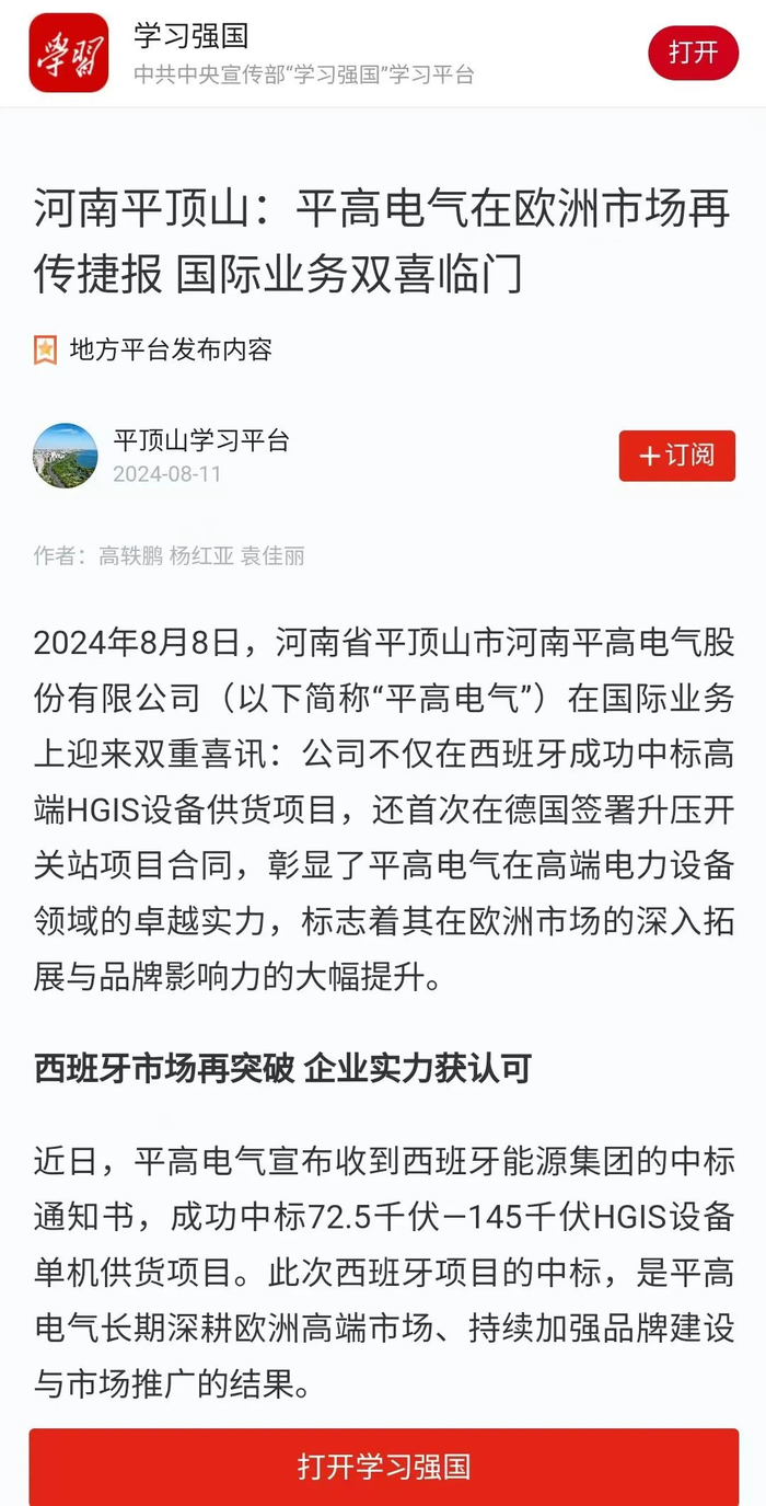 2024年8月8日,河南省平顶山市河南平高电气股份有限公司(以下简称“平高电气”)在国际业务上迎来双重喜讯:公司不仅在西班牙成功中标高端HGIS设备供货项目,还首次在德国签署升压开关站项目合同,彰显了平高电气在高端电力设备领域的卓越实力,标志着其在欧洲市场的深入拓展与品牌影响力的大幅提升。