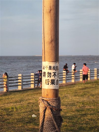 拾贝公园的沿海道路上,每隔一段距离就设置一块“禁止攀爬栏杆 禁止下海游泳 禁止抛物”警示牌。然而记者走访时看到,总有一些市民游客无视警示,直接爬上护栏坐着休息、拍照、玩手机。拾贝公园内的一座景观池,池底生长着大量水草,记者走访时甚至看到有孩童进入池中游泳。
