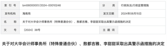 根据相关规定,海南证监局决定对大华所及两名注册会计师敖都吉雅、李甜甜采取出具警示函的行政监管措施,并记入资本市场诚信档案数据库。