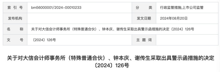 根据相关规定,广东证监局决定对大信所和相关注册会计师钟本庆、谢传生采取出具警示函的行政监管措施,监管部门同时要求大信所应对相关责任人进行内部问责。