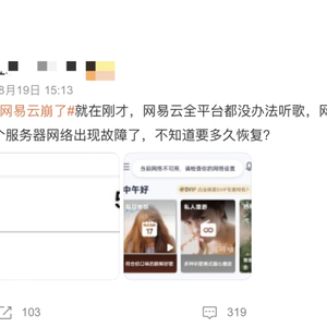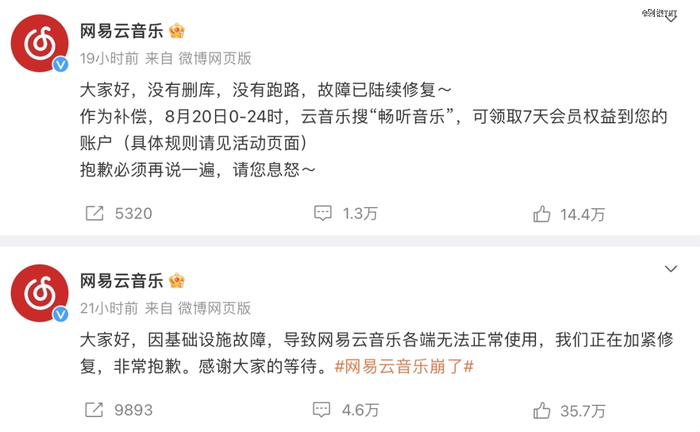 要知道,这种互联网大厂的大型技术BUG,通常在消息大面积扩散之前,很快就会被修复。而网易云音乐此次的BGU故障,长达2个小时,相关微博热搜也是轮番挂了近一天。