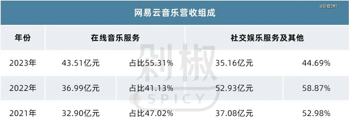 财报显示,2023年网易云音乐的在线音乐服务收入达到43.51亿元,超过了社交娱乐服务及其他带来的收入,但对比之下,社交娱乐服务相关业务依然占据着近一半的营收占比。