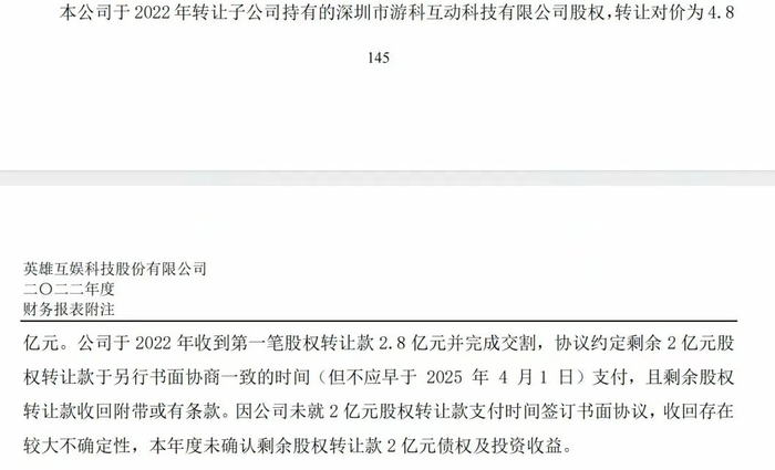 英雄互娱2022年年报显示,公司于2022年收到第一笔股权转让款2.8亿元并完成了交割。协议约定剩余2亿元股权转让款,另行书面协商一致的时间,但不应早于2025年4月1日支付,且剩余股权转让款收回附带或有条款。
