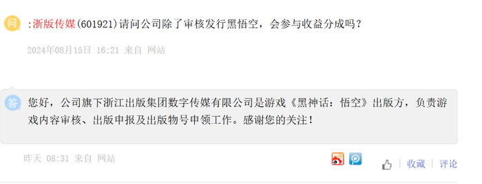 浙版传媒在互动平台仅回应称,公司旗下浙江出版集团数字传媒有限公司是《黑神话:悟空》的出版方,负责游戏内容审核、出版申报及出版物号申领工作。