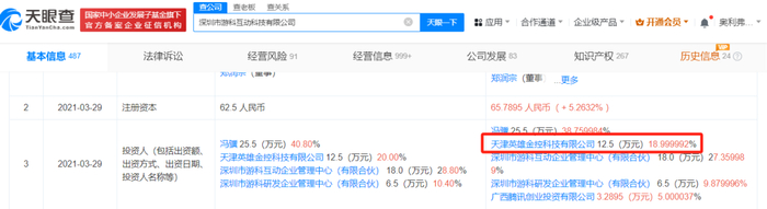 天眼查显示,2021年3月29日,英雄互娱持有互动科技约19%的股份,对应注册资本为12.5万元。
