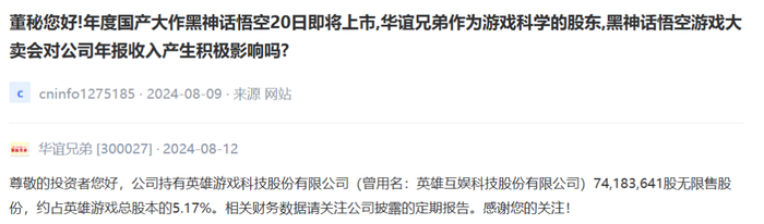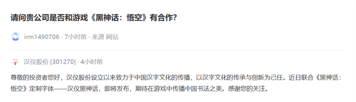A股部分上市公司除了受此影响出现股价异动,还有汉仪股份、浙版传媒、丝路视觉、华谊兄弟等上市公司,在互动平台回应是否与《黑神话:悟空》有合作,并提示谨防蹭热点。