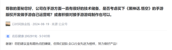 有投资者在互动平台提问名臣健康,公司在手游方面一直有很好的技术储备,是否考虑买下《黑神话:悟空》的手游版权,开发做手游自己运营呢?或者积极对接手游游戏制作也可以。