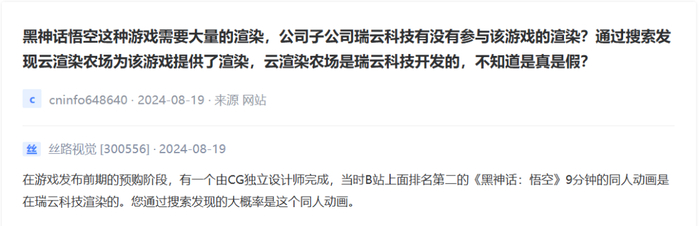 丝路视觉在互动平台称,在《黑神话:悟空》发布前期的预购阶段,有一个由CG(使用计算机图形技术创建游戏中的图像和动画)独立设计师完成。当时B站排名第二的《黑神话:悟空》9分钟同人动画,是在公司子公司深圳市瑞云科技股份有限公司渲染的。