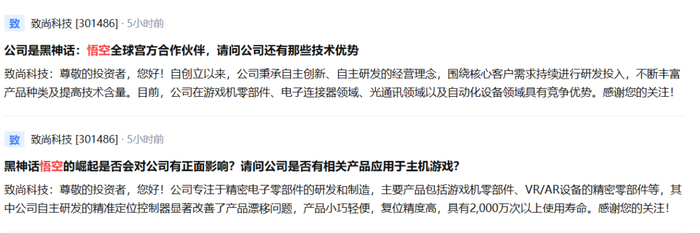 8月20日,有市场传言致尚科技向《黑神话:悟空》的全球官方合作伙伴八位堂供应零部件。八位堂系游戏手柄厂商,而致尚科技的精准定位控制器可用作游戏手柄,属于游戏周边产品。