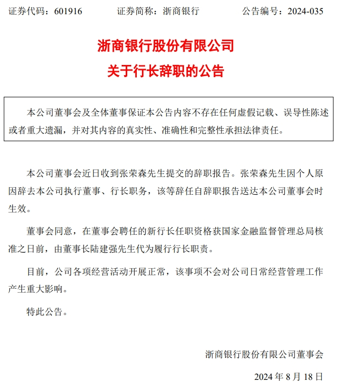 8月18日,浙商银行发布公告称,张荣森因个人原因辞去执行董事、行长职务,董事长陆建强代为履行行长职责。