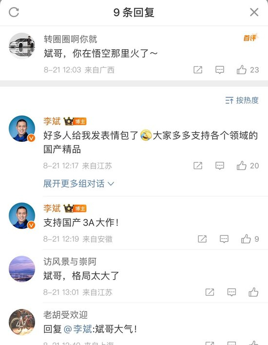 李斌则在微博回复:支持国产3A大作。
