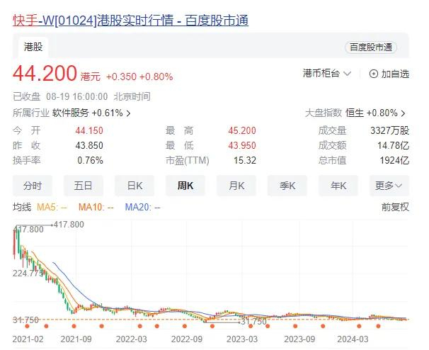 截至2024年8月19日收盘,快手(01024.HK)的股价是44.2港元/股。这个价格,相比几年前的高点足足跌去89%以上!