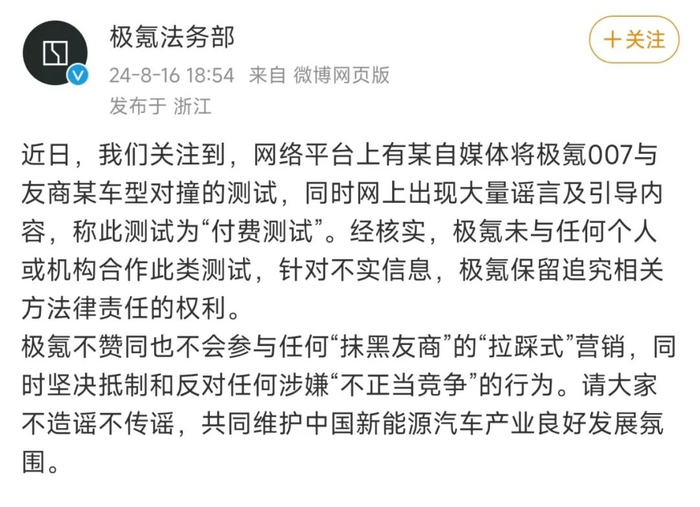 8月16日,“极氪法务部”官方微博发文称,近日网络平台上有某自媒体将极氪007与友商某车型对撞的测试,同时网上出现大量谣言及引导内容,称此测试为“付费测试”。经核实,极氪未与任何个人或机构合作此类测试,针对不实信息,极氪保留追究相关方法律责任的权利。
