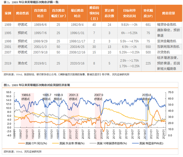 回顾1989年以来的6轮降息:1)三轮纾困式降息:1989-1992年降息主要由于储贷协会危机引发,而2001-2003、2007-2008年两轮降息周期中,美国先后爆发了互联网泡沫危机和次贷危机,席卷全球经济。为尽快推动经济复苏,期间美联储进行了多次降息。次贷危机中,15个月内共降息500BP,联邦目标利率降至0.25%极低水平,降息力度空前。2)两轮预防式降息:相较而言,从1995-1996年、1998年美联储降息来看,美国经济并未进入明显衰退,主要出于预防性质,首次降息幅度均为25BP,降息时间持续2-7个月,累计降息三次,最终联邦目标利率变化幅度均为75BP,预防式降息降幅有限,与纾困式降息差异明显。3)唯一一次混合式降息(2019):主要由于2020年突发事件新冠疫情的冲击,美联储降息节奏由预防式转变为纾困式,短期内目标利率大幅下降至0.25%,零利率状态延续近2年,其中预防式降息周期为19年8月-10月,纾困式降息周期为20年3月,短短一个月内连续两次降息,累计降幅达到150BP。
