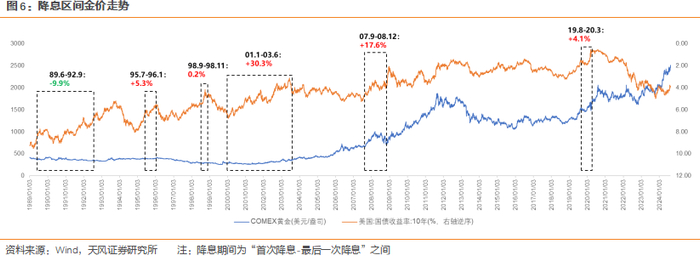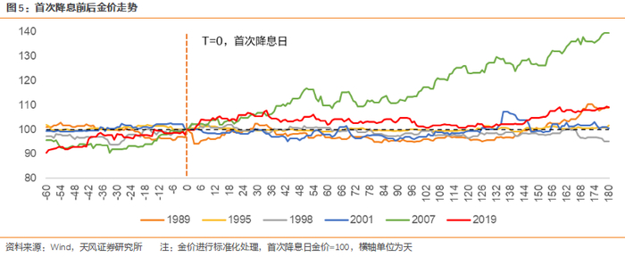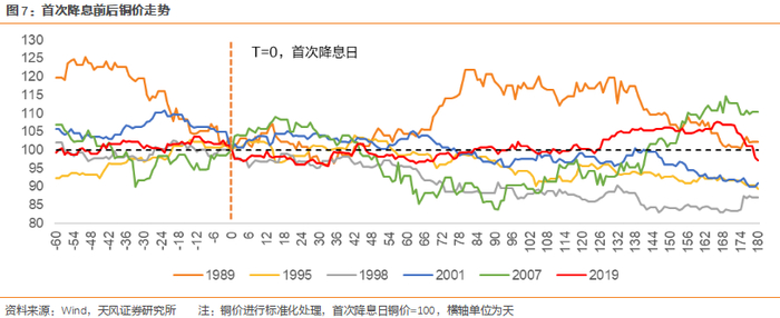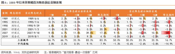 通过复盘1989年以来6轮美联储首次降息后金铜价格走势,我们发现: