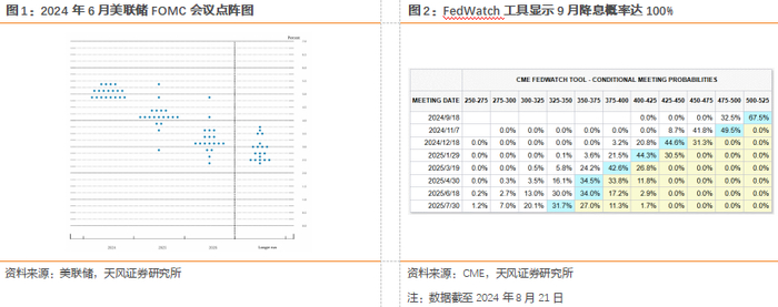 美联储9月降息或渐行渐近。根据2024年6月美联储议息会议点阵图显示,7名官员认为年内存在1次降息可能,8名官员认为年内存在2次降息可能。7月议息会议上,美联储政策重心从关注通胀到兼顾就业和通胀,鲍威尔指出9月降息是一个可能的选项。当周内,美国劳工部公布的7月就业数据显著弱于预期。总体上,我们判断鲍威尔发布会表述可能会强化9月降息预期。同时,芝商所FedWatch工具显示,市场定价美联储9月降息概率为100%,降息25BP/50BP的概率分别为67.5%/32.5%(数据截至8月21日)。
