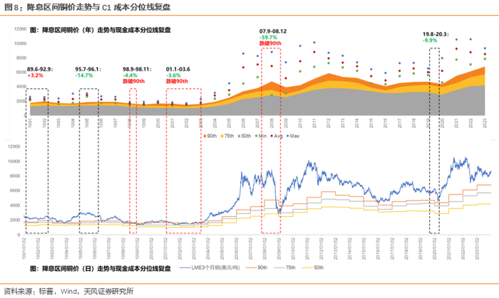 90分位成本线是较强的成本支撑位,历史上铜价只有在少数极端风险事件时才会跌破90分位C1成本。1989年以来的6轮降息周期中,1998、2001-2003、2007-2008年三轮降息周期中铜价击穿90分位成本线,对应风险事件分别为亚洲金融危机、互联网泡沫危机、次贷危机,前两次危机中铜价在75 分位成本位置附近企稳,次贷危机中,08年末铜价最低时一度触及50分位成本线。2020年疫情冲击下,铜价一度逼近90分位成本线,但并没有刺破。根据历史复盘结果,首次降息落地后,需求衰退程度或将决定降息周期中铜价走势,并且90分位成本线是较强的成本支撑位。