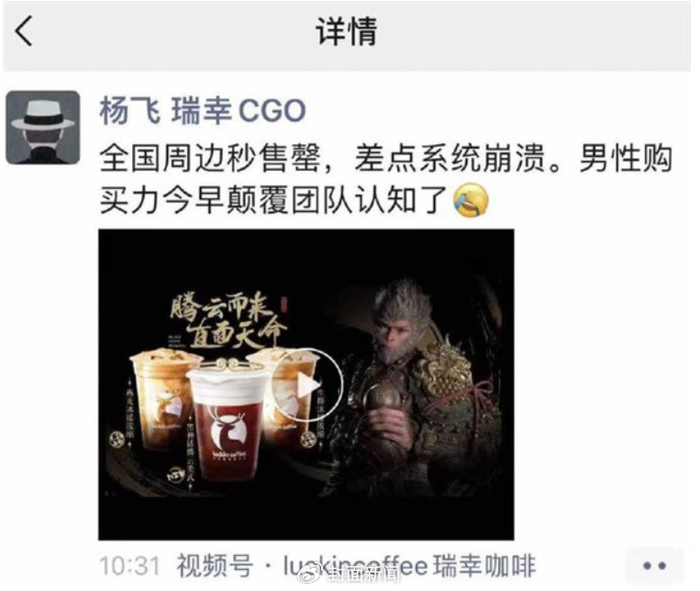 其火爆程度让瑞幸CGO(首席增长官)杨飞在朋友圈表示,(《黑神话:悟空》)全国周边秒售罄,差点系统崩溃,男性购买力今早颠覆团队认知了。