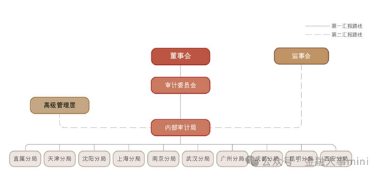 据了解,工行设立由内部审计局和 10 家内审分局组成的垂直独立的内部审计体系, 内部审计部门向董事会负责并报告工作,接受董事会审计委员会的检查、监督和评价,接受监事会的监督和指导。内审分局作为内部审计局的派出机构,向内部审计局负责并报告工作。