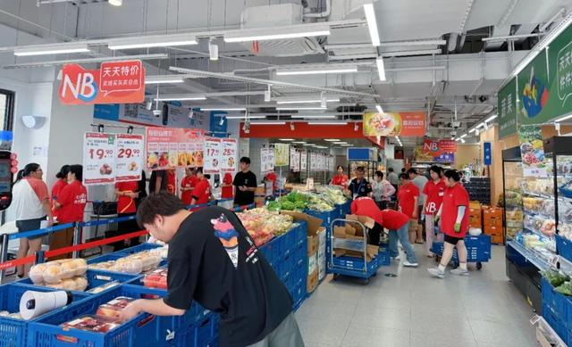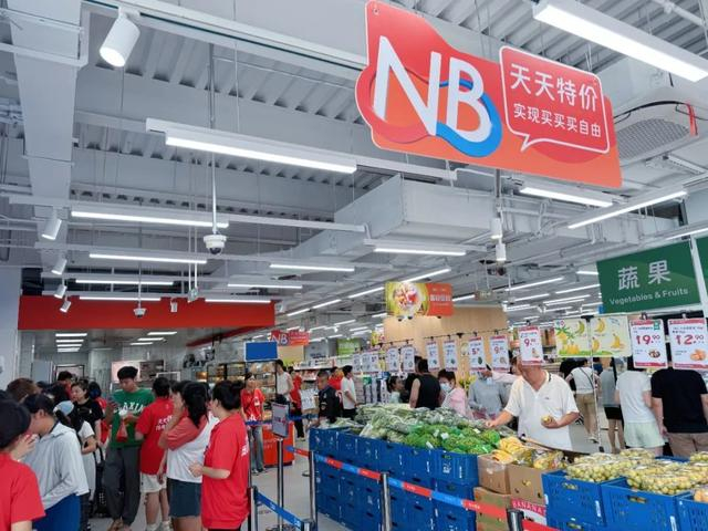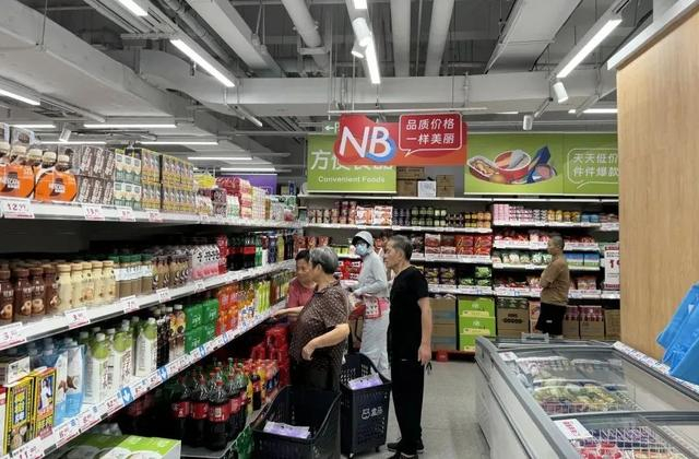 作为盒马旗下的硬折扣店品牌,盒马NB以社区商业为切入点,主打高性价比的零售模式,深受大众喜爱。早上8点多,占地约700平方米的新店人头攒动,烟火气充盈。货架上的商品琳琅满目,涵盖果蔬水产、熟食烘焙、冷冻速食、饮料零食、米面粮油、家居日用等品类。其中,盒马NB自有品牌的商品价格大约为大卖场在售同类型商品的50%。考虑前来购物的老年人较多,不习惯自助结账,门店在结算通道口设置专人,有序引导顾客去现金结算柜台。