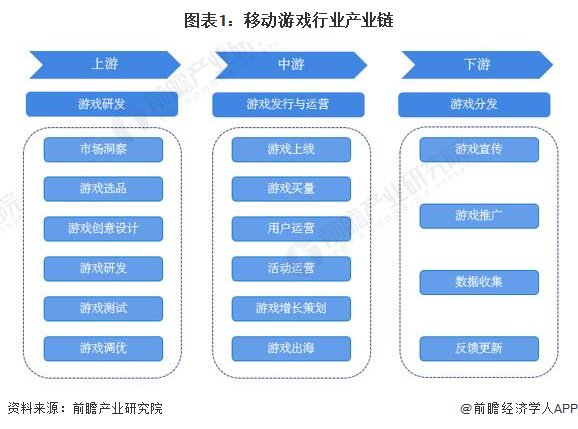 近年来,中国游戏行业不断优化资源配置,产业链逐渐完善,成为我国信息产业蓬勃发展的重要推动力之一,并成为我国文化创意产业的重要组成部分之一。据前瞻产业研究院统计分析,游戏产业链上游为游戏研发,中游为游戏发行与运营,下游为游戏分发。其中,游戏研发环节包括市场洞察、游戏选品、游戏创意设计、游戏研发、游戏测试和游戏调优等步骤,游戏发行与运营则包括游戏上线、游戏买量、用户运营、活动运营、游戏增长策划、游戏出海等过程,游戏分发则是在不同平台进行推广宣传、数据收集、反馈更新的过程。
