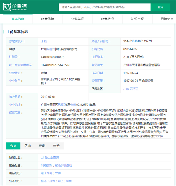 企查猫资料显示,广州网易计算机系统有限公司成立于1997年,注册资金为2,000(万人民币),法人代表是丁磊。2001年,网易正式成立在线游戏事业部。经过20多年的快速发展,网易已成为中国领先的游戏开发公司,一直处于网络游戏自主研发领域的前端,并与腾讯一起垄断了游戏行业大部分市场份额。