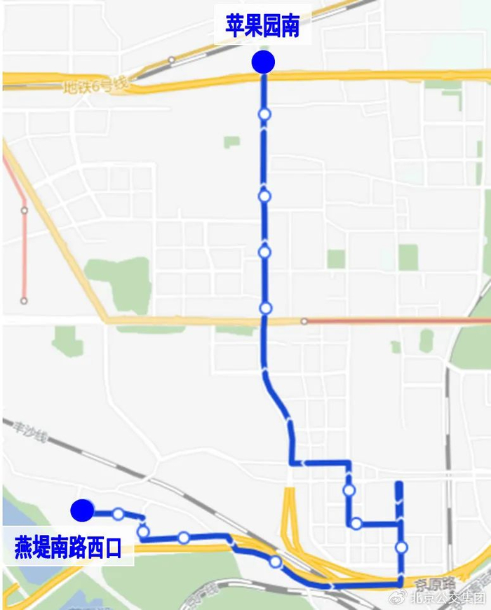 调整后首末站不变(燕堤南路西口-苹果园南)。