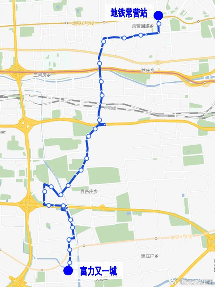削减朝阳路地面公交并行重复路段,补充常营南部地面公交服务空白,增加三间房东路、常营南路、常通路地面公交线网覆盖,方便双桥、豆各庄地区乘客接驳地铁6号线及前往朝阳医院常营院区的出行。