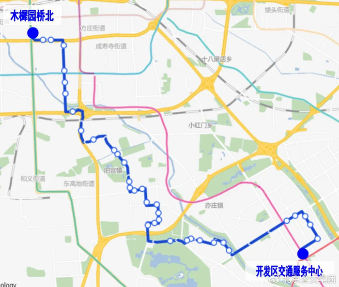 调整后首末站不变(开发区交通服务中心→木樨园桥北/木樨园→开发区交通服务中心)。