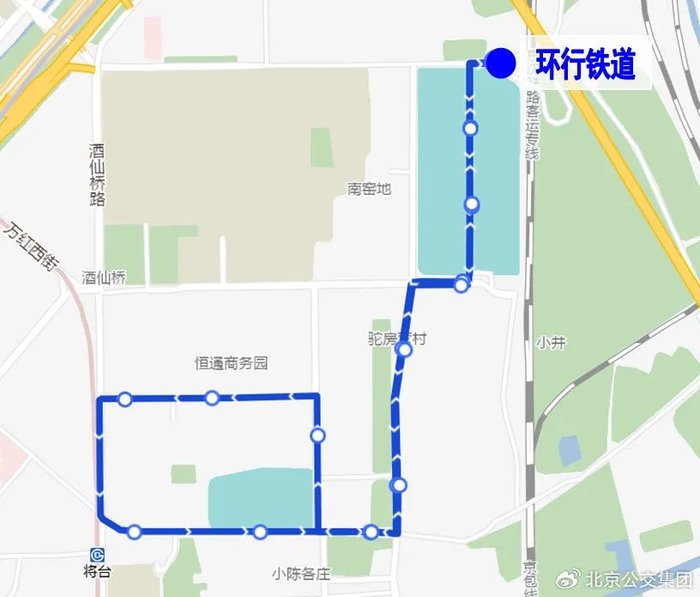由环行铁道发出,经酒仙桥北路、产业园中路至万红路东口,沿专123路、专124路原路由至将台路口东(接驳地铁14号线)、万红路东口返回环行铁道。
