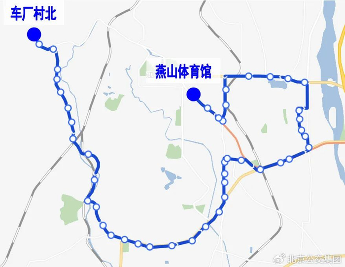由车厂村北发出,沿F38路原路由至房山大角南,向东沿F80路原路由至燕山体育馆。