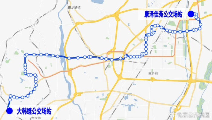 沿途设站:大韩继公交场站、大韩继村口、龙乡苑、周口店路口、周口村路口、房山云峰寺路口、顾册西、顾册、牛口峪路口、房山南关立交桥南、房山南关、永安西里路口(开往大韩继公交场站方向)、房山中医医院、房山南大街、房山大角南、房山西大街、洪福家园、山水家园、洪顺家园、洪寺村口、洪寺村、原香嘉苑、燕房路北口、燕山北庄、燕化聚酯厂、燕化动力厂、丁家洼、羊头岗村、羊头岗、房山桥梁厂、房山焦庄村、房山焦庄村东、大董村北、小董村、大紫草坞村、北京理工大学分校、阎村、炒米店路口、阎村桥、苏庄西街南口、地铁苏庄站、苏庄东街南口、房山区政府第二办公区、地铁良乡南关站西、西潞南大街、南关西路、拱辰南大街、良乡大角、良乡医院、良乡北关、良乡北关北、房山区政府、行宫小区南门、行宫南门路口(开往康泽佳苑公交场站方向)、送变电公司路口西(开往康泽佳苑公交场站方向)、行宫小区东门、吴店西里、黄辛庄东里、龙华苑小区、黄辛庄路口西、原香小镇、长阳一村、天骄俊园小区、碧波园、地铁广阳城站北、长阳滨水公园南、张家场村口、西悦雅居、半岛广场南、杨庄子、馨然嘉园、长阳镇政府、长政北街南口、长政北街、长阳周转房东区、康泽佳苑公交场站。