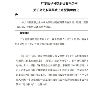 上周五,*ST超华公告称,公司股票已被深交所决定终止上市,并将于2024年8月19日被摘牌。