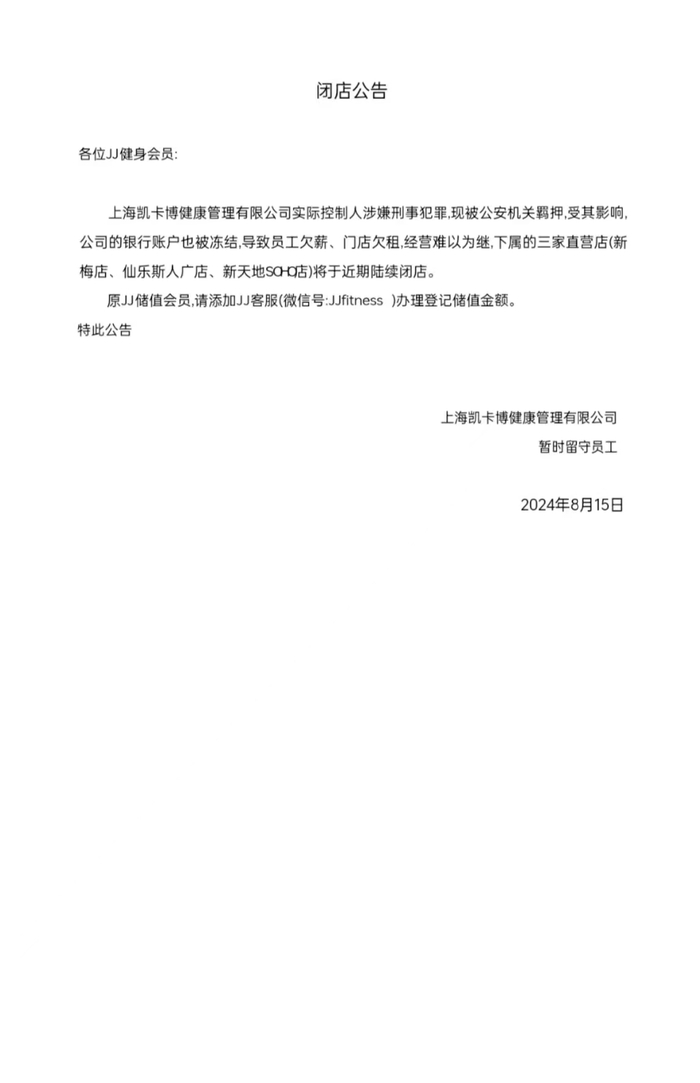 近日,连锁健身机构Justin&Julie Fitness(简称JJ健身)也宣布闭店。据公告称,公司实际控制人涉嫌刑事犯罪,现被公安机关羁押,公司银行账户被冻结,导致员工欠薪、门店欠租。因经营陷入困境,三家直营店将陆续关闭。