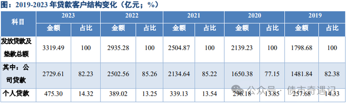 从发放贷款结构来看,贵州银行贷款结构以公司贷款客户占比为主。公司贷款2019年到2023年的复合增长率为16.50%,个人贷款的复合增长率为16.54%,两者增速相当。但从同比增速变化来看,2021-2023年公司贷款增速分别为29.34%、17.24%和9.07%,对公客户的发放贷款的增速明显下降;而同期,对个人客户发放贷款的同比增速分别为14.50%、14.71%和22.18%,增速显著提升,未来个人贷款占比有望提升。