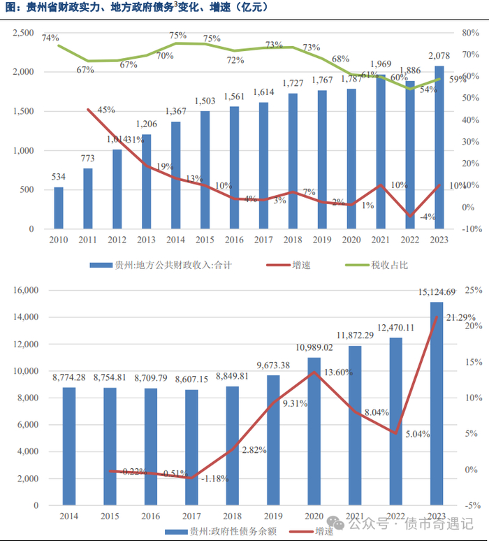 从地方财政来看,一般预算收入增速降幅明显,2019年以来税收收入占比也呈下降趋势,财政稳定性下降。在没有强有力的产业支撑的背景下,贵州省的财政压力越发凸显。再看贵州的地方政府债务变化,2010-2014年地方政府债务扩张了3倍多,2014-2018年变化不大,该时间段主要依赖于城投举债,2019年起在地方城投市场认可度下降的背景下,地方政府债务增速再次扩大,截至2023年末,贵州省地方政府债务余额为15124.69亿元,仅次于湖北省和安徽省,在全国排名第11位,城投有息债务余额13,409.44亿元,城投有息债务/一般预算收入为6.45,区域广义债务率为654.41%,考虑转移收入后的广义债务率为329.12%。与贵州省的地方财政收入体量及增速相比,贵州省的债务问题依旧严峻。