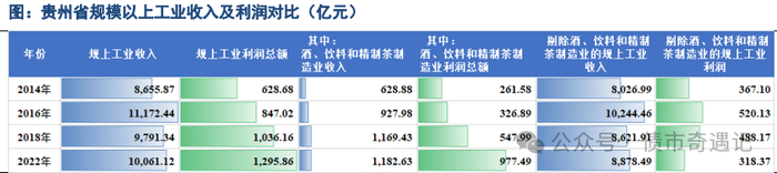 提到产业,“茅台”也已经成为了贵州产业的代名词,“贵州茅台”确实也是贵州最拿得出手的产业。2014年-2022年,贵州省规模以上工业收入从8655.87亿元增至10061.12亿元,增幅不大,利润总额从628.68亿元增至1295.86亿元,增长近2倍,而其中酒、饮料和精制茶制造业的利润总额增长近4倍,2022年剔除该行业后的规上工业利润仅为318.37亿元,甚至低于2014年的367.10亿元,可见,酒、饮料和精制茶制造业以约10%的收入创造了75.43%的工业利润。综上,酒、饮料和精制茶制造业对当地经济以及税收的贡献度是巨大的,而2014年以来,贵州省除去酒、饮料和精制茶制造业以外,规模以上工业中其他行业发展基本处于停滞。