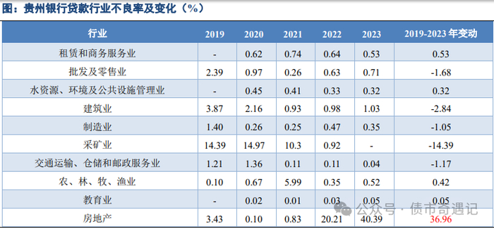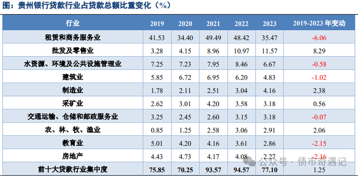 贷款行业分布方面,可以看出近几年贵州银行的贷款行业集中度依旧处于较高水平,需防范相关行业集中度风险。以2023年末为例,该行贷款主要分布在租赁和商务服务业,批发及零售业,以及水资源、环境及公共设施管理业,前三大行业占比均在5%以上;此外建筑业和制造业占比也较高,前五大行业贷款合计占比62.70%,前十大行业贷款占比77.10%,贷款行业集中度较高。从贷款行业占比变动来看,2021年以来,租赁和商务服务业贷款比重从最高点的49.49%下降至2023年的35.47%,下降了14.02个百分点,但占比仍很高,信贷资源向其他行业倾斜;批发和零售业贷款呈上升趋势;前五大行业中建筑业,水资源、环境及公共设施管理贷款占比均呈现下降;制造业有所上升。前十大行业中教育业和房地产业贷款占比有所下降,农、林、牧、渔业有所上升。