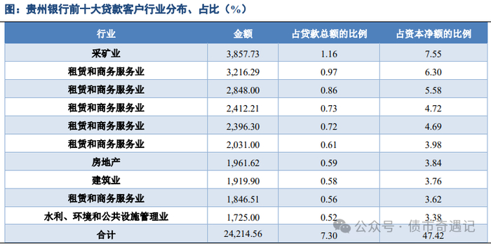 贷款客户集中度方面,截至2023年末,贵州银行向最大单一借款人的贷款余额为38.58亿元,占贷款总额的1.16%,占资本净额比例7.55%;向前十大单一借款人的贷款总额为242.15亿元,占贷款总额的7.30%,占资本净额比例47.42%,贷款客户集中度较高。从前十大贷款客户的行业分布来看,第一大行业为采矿业,占净资本比重7.55%,除此之外前五大贷款客户行业均为租赁和商业服务业,也就是投放于当地基础设施建设/城投公司的贷款,此外前十大贷款客户行业还包括房地产、建筑业和水利、环境和公共设施管理业,同样可能是当地的城投公司。考虑到贵州银行作为当地可撬动的地方金融资源之一,贵州银行受到了区域城投的影响是必然的。