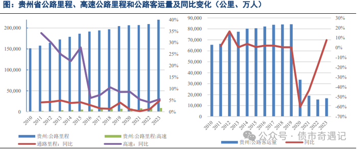 再从贵州基建的成果来看,在“县县通高速”的口号下,贵州省公路里程从2010年末的15.16万公里增至2023年末的21.98万公里,其中高速公路历程增长的更快,从2010年末的0.15万公里增至2023年末0.88万公里。然而,公路里程的增长并未带来客运量的增长,即使在2020年前贵州省的客运量增速也远不及公路里程/高速里程的增速,而2020年疫情后贵州省客运量降至约2019年的三分之一,2023年贵州省的客运量也并未恢复至疫情前水平,仅恢复至2019年客运量的约20%。这也侧面反映出了贵州省经济社会各方面的运转距疫情前相距甚远,恢复尚待时日。