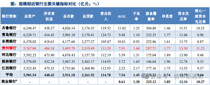 与同规模/区域银行对比来看,贵州银行与相近规模城商行相比,ROE和净息差接近平均水平,核心一级资本充足率表现较好,存款规模、不良贷款率水平有待改善。此外贵州银行的股东背景要优于同区域的贵阳银行,但存在关注类贷款比率较高等压力。