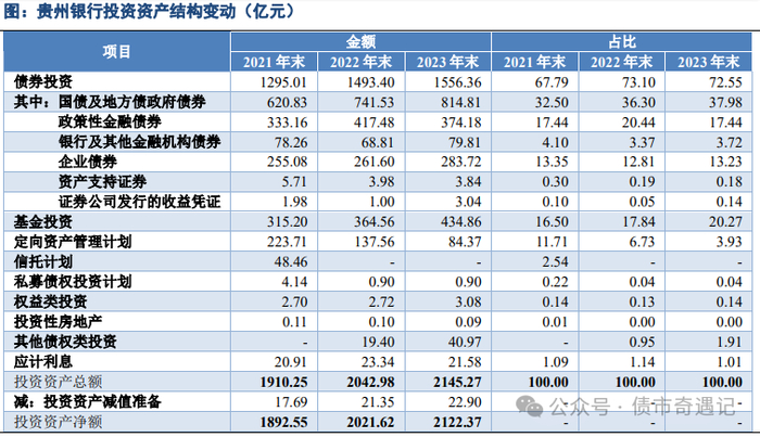 其他金融资产还包括基金投资、定向资产管理计划、其他债权类投资等,2023年末占比分别为20.27%、3.93%和1.91%。近几年,基金投资占比有所上升,全部为公募基金,截至2023年末,公募基金占投资资产总额的20.27%,包含货币基金和债券基金,债券基金底层资产主要为利率债。非标投资方面,近几年贵州银行的定向资产管理计划和信托计划金额持续压降,占比也从14.25%降至3.93%。