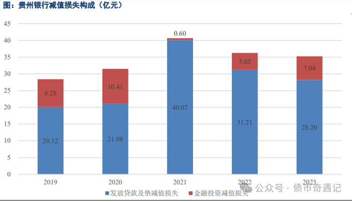 营业支出方面,贵州银行营业支出主要是管理费用和资产/信用减值损失。2021-2023年管理费用/营业收入分别为30.63%、30.40%和33.28%,管理费用占比较高,且2023年小幅提升。同期,资产/信用减值损失合计分别为39.00亿元、38.56亿元和33.24亿元,虽小幅下降但年损失规模仍较大,主要为贷款减值损失,2023年为28.20亿元;其中投资资产减值损失2021-2023年分别为0.60亿元、5.05亿元和7.04亿元,呈现上升,年末减值准备余额分别为17.69亿元、21.35亿元和22.90亿元。