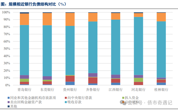 与同规模银行对比来看,下图为截至最新报告期的负债构成情况,与同规模城商行相比,贵州银行负债中的吸收存款的占比是最低的;相反,应付债券、向中央银行借款以及同业存放款项占比较高,对债券(含存单)融资和同业借款更为依赖。
