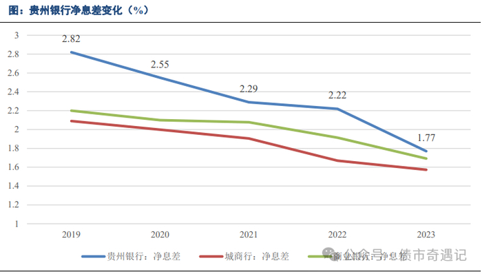 贵州银行净息差在2023年已经跌破2.00%至1.77%,近五年净息差持续下降,与城商行和商业银行总体水平的优势在逐步缩小,盈利能力有所减弱。
