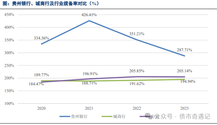 拨备覆盖率方面,2023年末贵州银行拨备覆盖率为287.71%,连续2年下降,较2021年末下降了138.70个百分点,降幅较大,尽管仍高于行业平均覆盖拨备率205.20%,但未来是否延续下降仍值得关注。